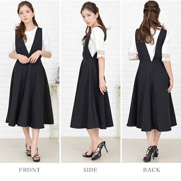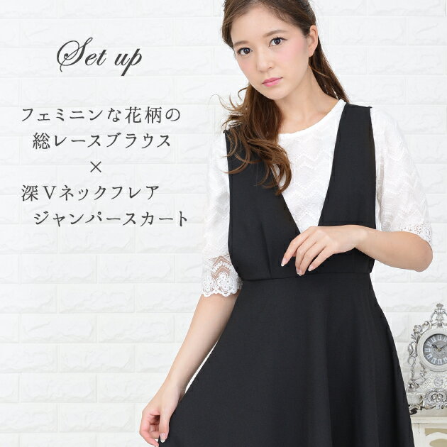 ワンピース 大人 レディース ミモレ丈 膝下 深V ジャンパースカート ジャンスカ オールインワン サロペット ミディアム丈 レーストップス 5分袖 2点セット ホワイト ブラック 通販 刺繍 春 夏 秋 シンプル