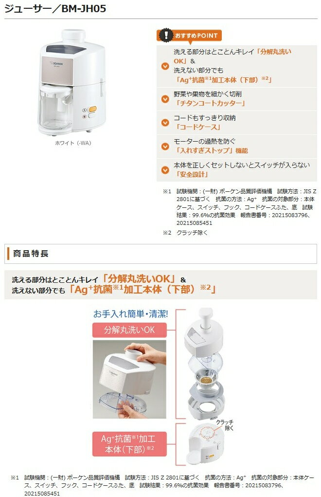象印 ジューサー [BM-JH05-WA] 象印 ステンレスマグ/ステンレスボトル はこちらから↓↓ 《ご注意点》 ●通常2-3営業日ほどで発送予定です。